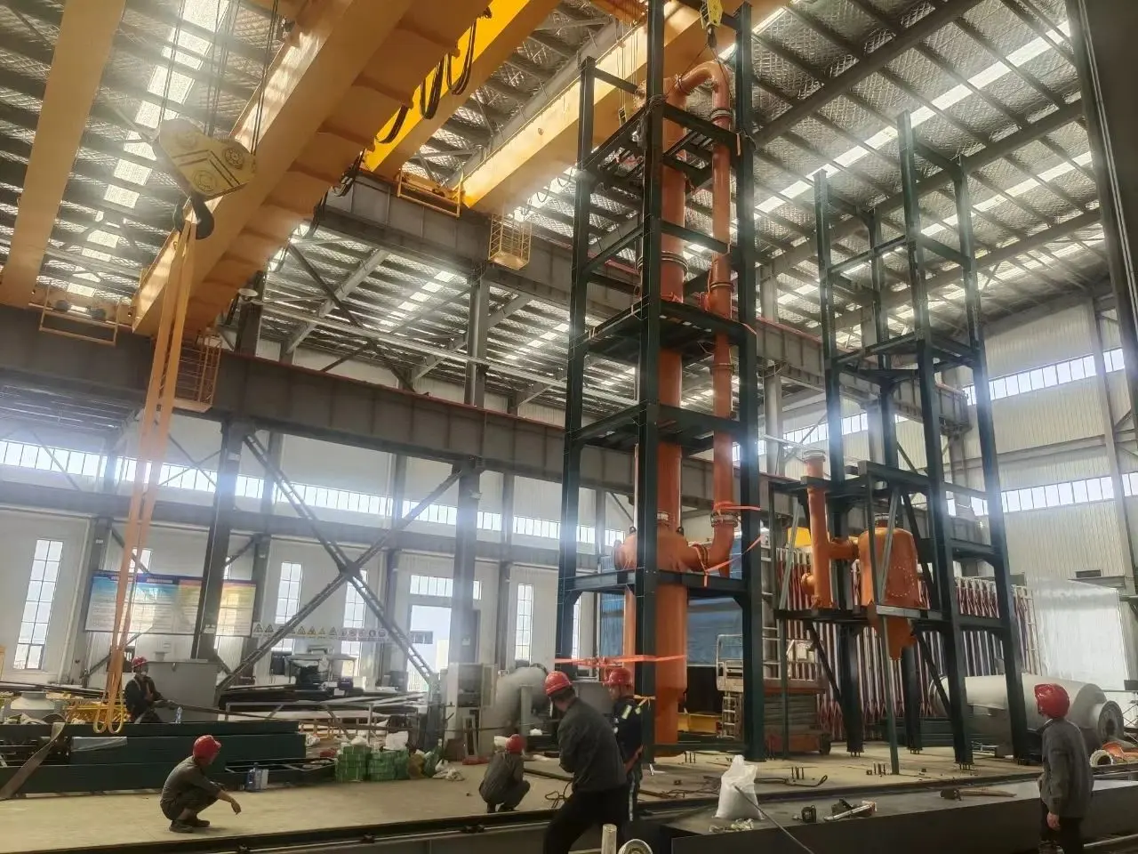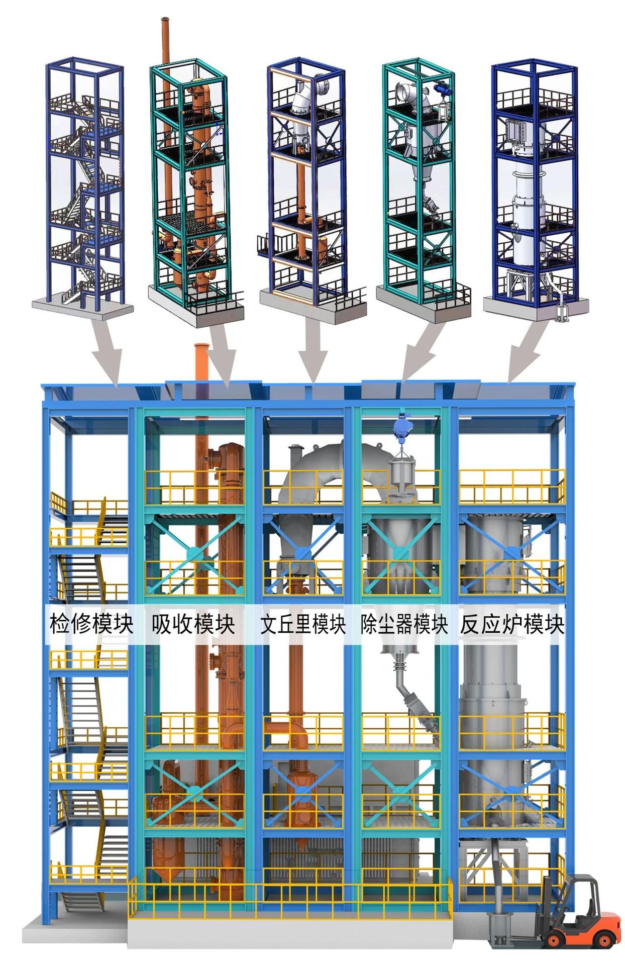 本项目是公司广泛推广的首套1.5m³/h小型模块化流化床酸再生机组。首次采用机组主要部件在车间预拼装、预测试后,以模块化形式发往中天项目现场进行组装,极大地缩短了现场安装调试时间,工程速度显著提升。1.5m³/h小型模块化流化床酸再生机组对于废酸处理量较小的用户极度友好,避免了因废酸供应不足而出现长时间待机,进而造成的资源浪费,投资成本低,回报率高。