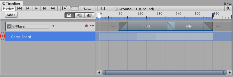 Triangle icon (circled) collapses the tracks in the Game Board Track group. A ghost track visually represents the tracks in the collapsed group.