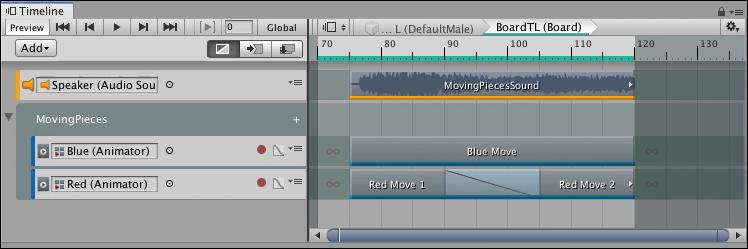 To create a nested Timeline instance, drag a GameObject associated with a Timeline instance into another Timeline instance. The Timeline instance you are dragging into becomes the master Timeline instance. The Timeline instance associated with the GameObject becomes a nested Timeline instance.