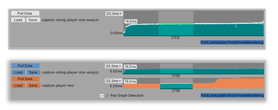 Top, the Frame Control pane in Single view, with the graph ordered by frame duration, and a range of frames selected. Bottom, the Frame Control pane in Compare view, with the graph ordered by frame duration, and a range of frames selected.