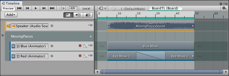 To create a nested Timeline instance, drag a GameObject associated with a Timeline instance into another Timeline instance. The Timeline instance you are dragging into becomes the master Timeline instance. The Timeline instance associated with the GameObject becomes a nested Timeline instance.